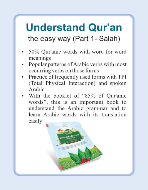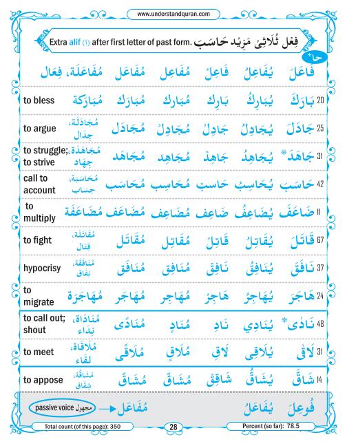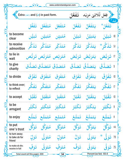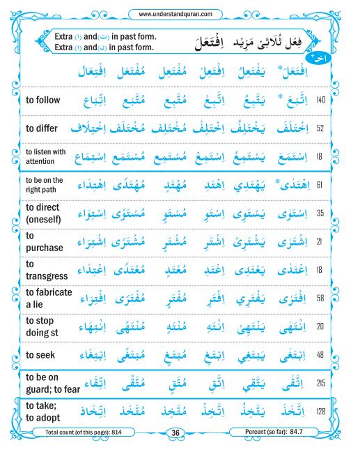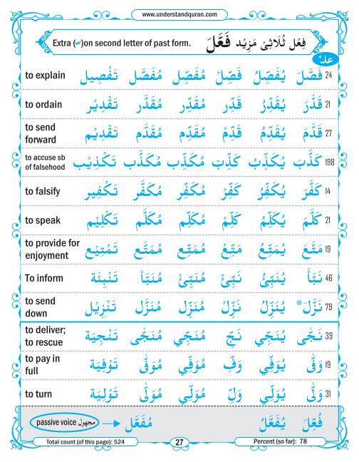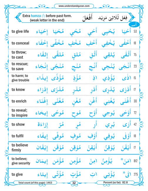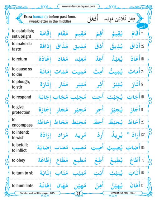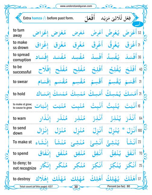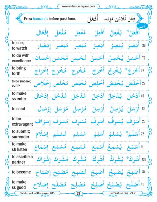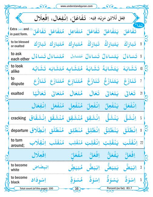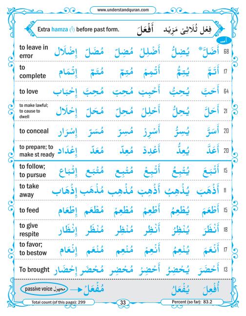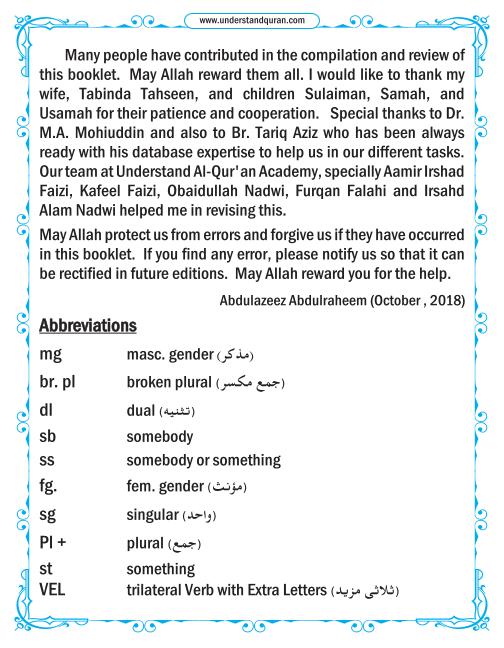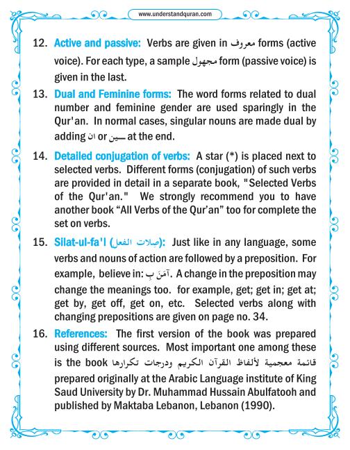 This Book provides a preface and explanation for a word list that classifies 85% of the words used in the Quran to aid in memorization and understanding. Some key points: 1) The word list accounts for 85% of the total words in the Quran and provides the most common meanings. 2) The most frequently occurring words that make up 41% of the total are listed first. 3) Nouns are listed from pages 7-14 and verbs from pages 15-33, showing frequency. 4) Words are generally arranged alphabetically but some verbs are grouped by type. 5) Additional resources like selected verb conjugations are referenced to aid further study.
