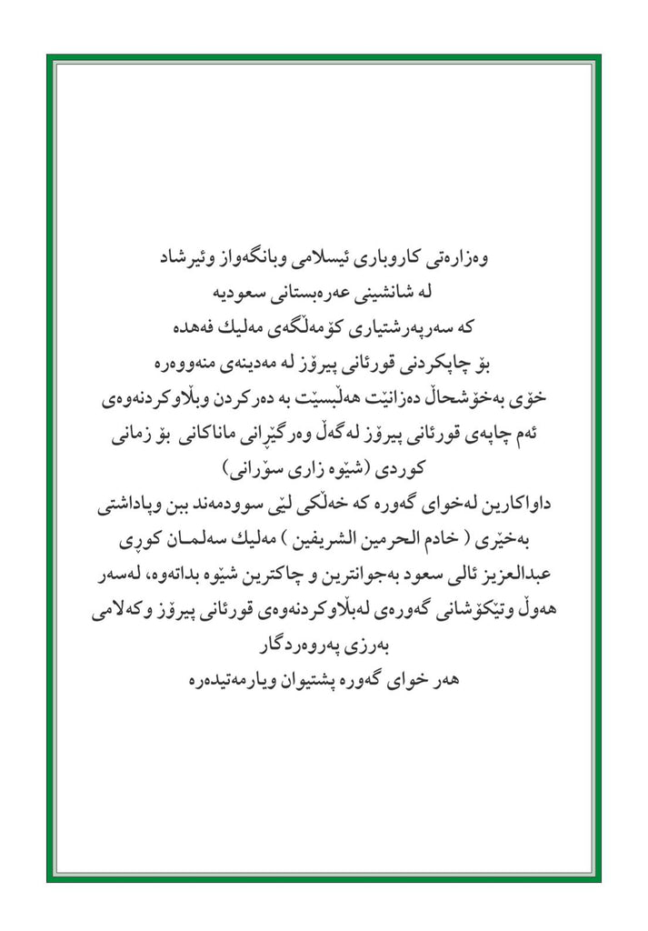 Download the complete Kurdish (Sorani Dialect) Quran Translation in PDF format from our website. Our carefully curated translation provides an accurate and accessible understanding of the Quran in the Sorani dialect, perfect for Kurdish speakers. Whether you're looking for personal study or sharing with others, this free resource is available to help you connect with the Quran in your native language