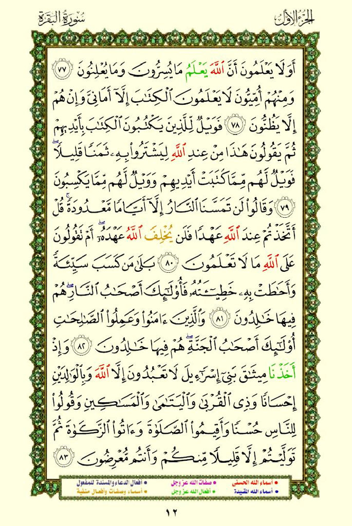 In this Mus'haf the Names (Al-Asma), Attributes (As-Sifat) and Actions (Al-Afa'al) of Allah (سبحانه وتعالى) are highlighted in different colors. The PDF file has a bookmark panel to easily navigate through the Chapters (Surahs).
