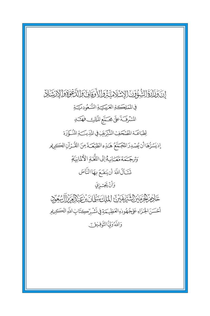 The German translation of the Quran aims to provide German-speaking readers with accurate and accessible understanding of the Holy Quran's divine message. This translation, known as "Al-Almaniya," strives to faithfully convey the meanings, teachings, and spiritual guidance contained in the original Arabic text. It serves as a valuable resource for Muslims and non-Muslims alike who seek to explore the Quran's profound message in the German language, fostering greater knowledge, reflection, and appreciation of Islam's sacred scripture.