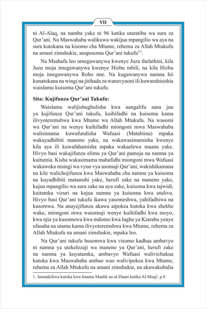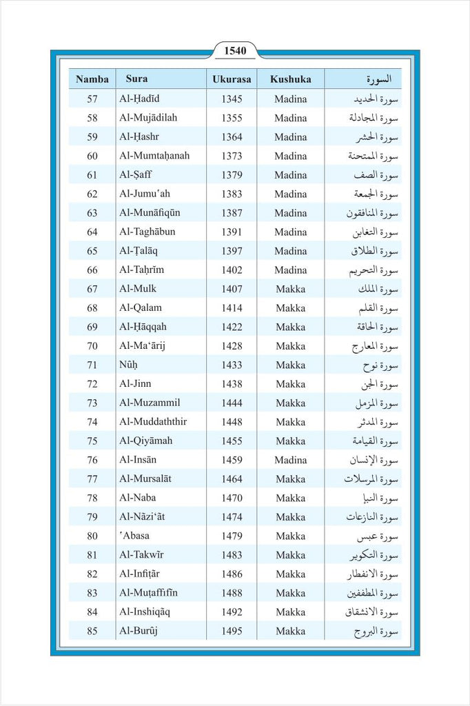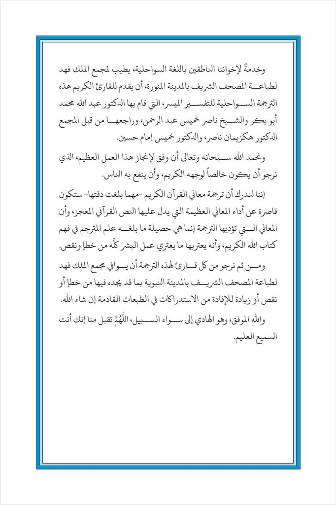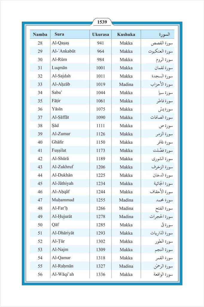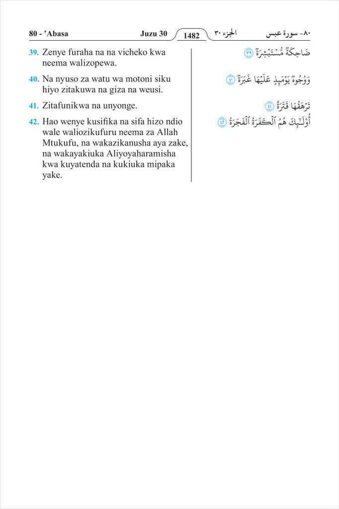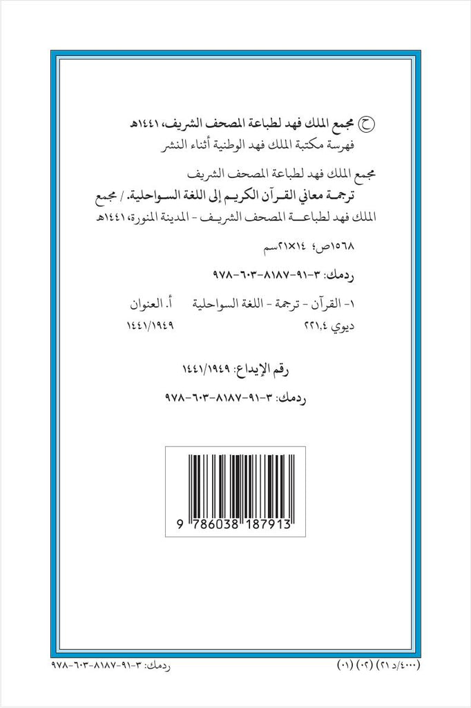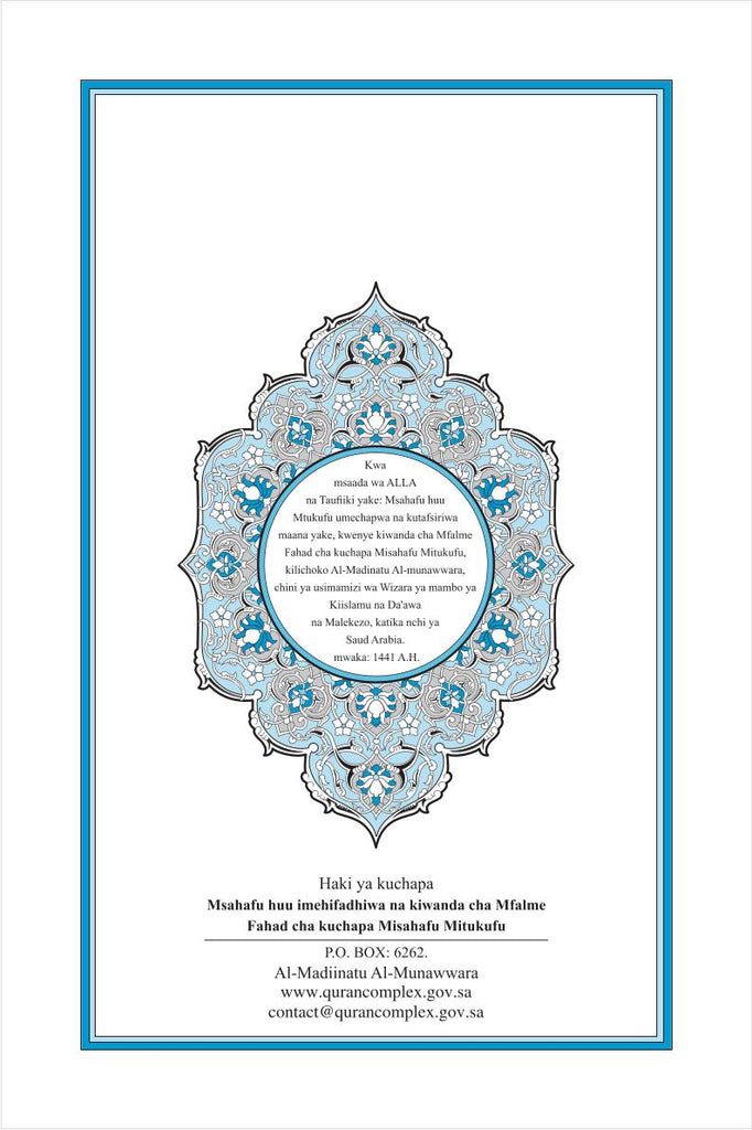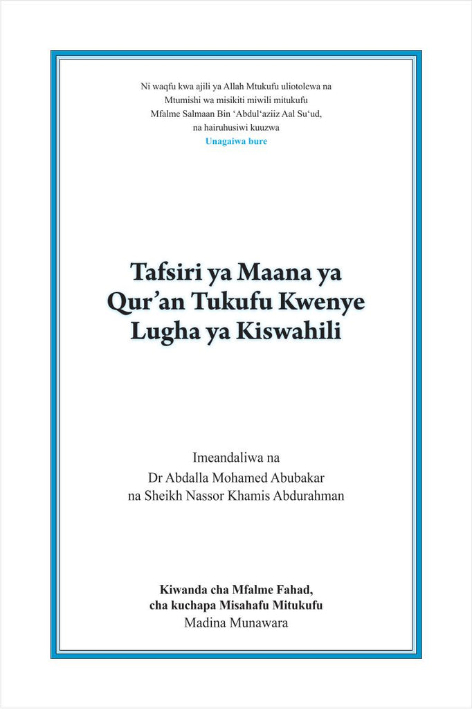 Swahili Kiswahili Holy Quran Translation السواحلية, presents the meanings of the Holy Quran in Swahili, a major language spoken across East Africa including Tanzania, Kenya, Uganda, Rwanda, Burundi, and the Democratic Republic of the Congo. It allows Swahili-speaking Muslims to read and understand the words of Allah in their widely used language, supporting clear comprehension, reflection, and teaching in homes, masaajid, and Islamic schools throughout the region and the global Swahili-speaking community